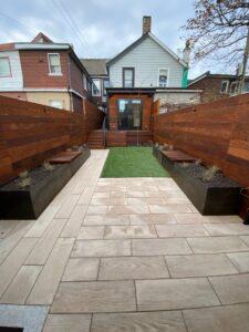 Decorative trees/ shrubs are always a good idea. For example, mini palms or thuja planted around the perimeter in large garden planters will make your patio much more cozy and attractive. If you have wild plants on your property, then consider whether they are worth destroying. You will not go wrong if you leave a piece of the unspoiled natural landscape, such as old trees, stone, or wild plants, which can symbolize unity with nature.